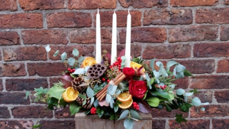 A traditional Christmas table centre arrangement. Luscious foliage, full of fragrant cinnamon sticks and orange slices, berries, pine cones, holly and thistle. Finished with 3 tapered candles.