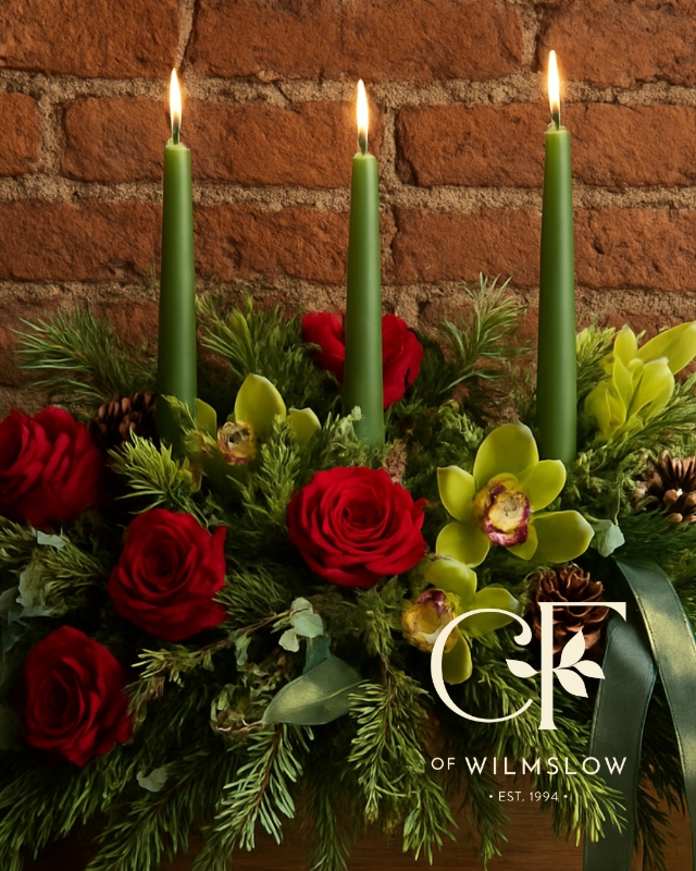 Create a warm and elegant holiday atmosphere with our luxurious Midwinter Table Decoration. This premium centerpiece features a trio of glowing candles surrounded by a stunning blend of rich red roses, fresh green orchids, and a curated selection of complementary festive foliage and accents.