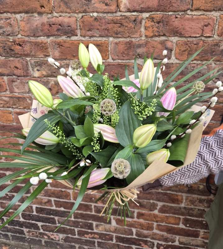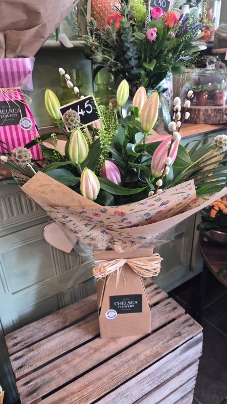 A selection of premium Lilies, Pussy Willow and complementary foliages. Stems left long. We can offer Pink or White, let us know if you have a preference. if no preference stated our Florists will select the best for you.